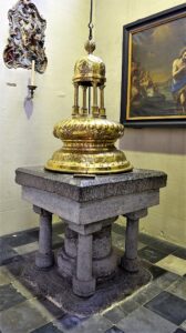 De romaanse doopvont uit lokale hardsteen komt uit een Doorniks atelier. Zij dateert vermoedelijk uit de 1ste helft van de 13de eeuw en is waarschijnlijk het enige voorwerp uit de (pre-)romaanse Sint-Waldetrudiskerk. Het toegevoegde bovenstuk is een gerecycleerde grafsteen! Het doopwater wordt stofvrij gehouden door het koperen deksel met takel van Geraard Van Opstal (1642).