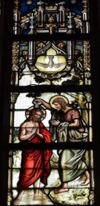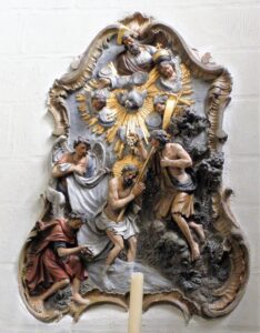 Nabij de doopvont hangt, zoals het hoort, Het doopsel van Christus, ditmaal een gepolychromeerd hoogreliëf in terracotta, zwierig geboetseerd door Jan Cosijns (Antwerpen, 1762-‘63). Typisch voor rococo zijn de talloze engelen, de rocailles en de S-curven die de sierlijke lijst vormen. Bovenaan kijkt God de Vader, in buste, toe, de wereldbol in de ene hand, terwijl Hij met de rechterhand zegent. De driehoek achter zijn hoofd wijst op de Drieëenheid. Wordt niet elk kind hier gedoopt in de naam van de Vader, de Zoon en de Heilige Geest? De zinnebeeldige duif die in een stralenkrans uit de hemel afdaalt, illustreert het getuigenis van Johannes de Doper: “Ik heb gezien hoe de Geest als een duif uit de hemel neerdaalde en op Jezus bleef rusten’ ” (Joh. 1:32; ook 1:33); “Ik heb het gezien, en mijn getuigenis luidt: dit is de Zoon van God” (v.34) (= Mt. 3:16-17).