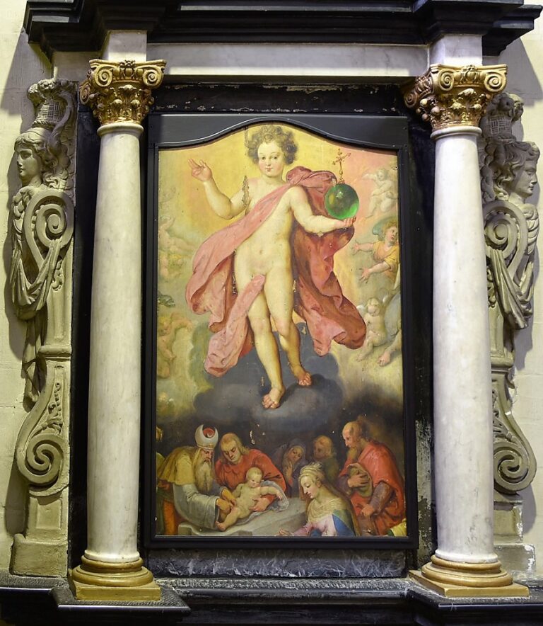 De belangrijkste voorstelling is die van de kleine Jezus als de Heiland, de ‘Christus Salvator’. Aldus neemt Hij hier reeds de kenmerken van dat iconografische, volwassen type over. Net als de Verrezene is Hij naakt, enkel gekleed met een loswapperende roodachtige mantel, Hij draagt de wereldbol in de hand en zegent.