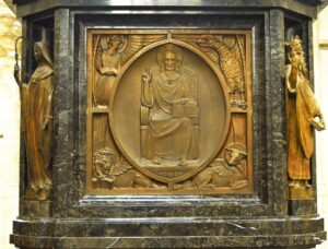 In de rechteruithoek, aan Petrus’ zijde, prijkt de buste van de heilige Maria Magdalena met haar typische lange haren, als boetvaardige zondares gehuld in een boetekleed. In de linkeruithoek, aan Paulus’ zijde, de buste van St.-Catharina, echter zonder attributen.