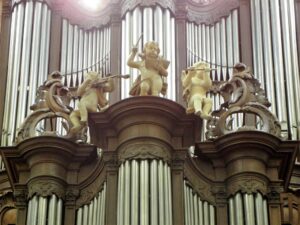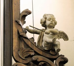 Zingende en musicerende engelen, die wit geschilderd à la rococo tegen het bruine hout afsteken, stimuleren de vreugde van de lofprijzing van God. Vooraan, op het rugpositief, wordt de engel die met een open boek en een dirigeerstok in het midden staat, geflankeerd door 2 zittende engelen: links met viool en strijkstok en rechts met een dwarsfluit. Op de grote orgelkast prijken ook 3 engelen. Aan de linkerkant zit een engel met een fagot(?), met één beentje vrolijk vooruit. Aan de rechterkant zit een ernstig engeltje dat een dirigeerstok hanteert. In het medaillon dat het geheel bekroont, bespeelt St.-Cecilia, de patrones van de kerkmuziek, een positieforgel. Daarboven steekt een vliegende engel de bazuin.