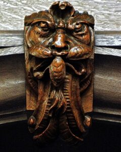 In het exemplaar van de noordkoorgang dragen de engelen naast het hokje van de biechtvader Jezus’ passie-instrumenten: de doornenkroon en de legendarische zweetdoek van Veronica met de afdruk van Jezus’ gelaat. Dankzij Jezus die door zijn liefdeoffer “de zonden van de wereld wegdraagt” is verzoening tussen de mens en God hier mogelijk. De engel die aan weerszijden het hoofd fel buigt in de richting van de biechtvader, lijkt te alluderen op de houding van de biechteling vóór hem. Waar mogelijk zorgen fantasierijke maskers bij dit ‘ernstige’ kerkmeubel voor een speelse toets: 2 grote exemplaren op de deurposten, eentje in de boog van het priesterhokje en ook een in de bekronende fries. Het toegevoegde beeldje van de kloosterlinge bovenop het priesterholje is waarschijnlijk de patrones St.-Waldetrudis.