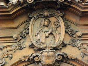 Boven de deuren van het Lodewijk XV-doksaal prijkt het medaillon met de figuur van St.-Waldetrudis.