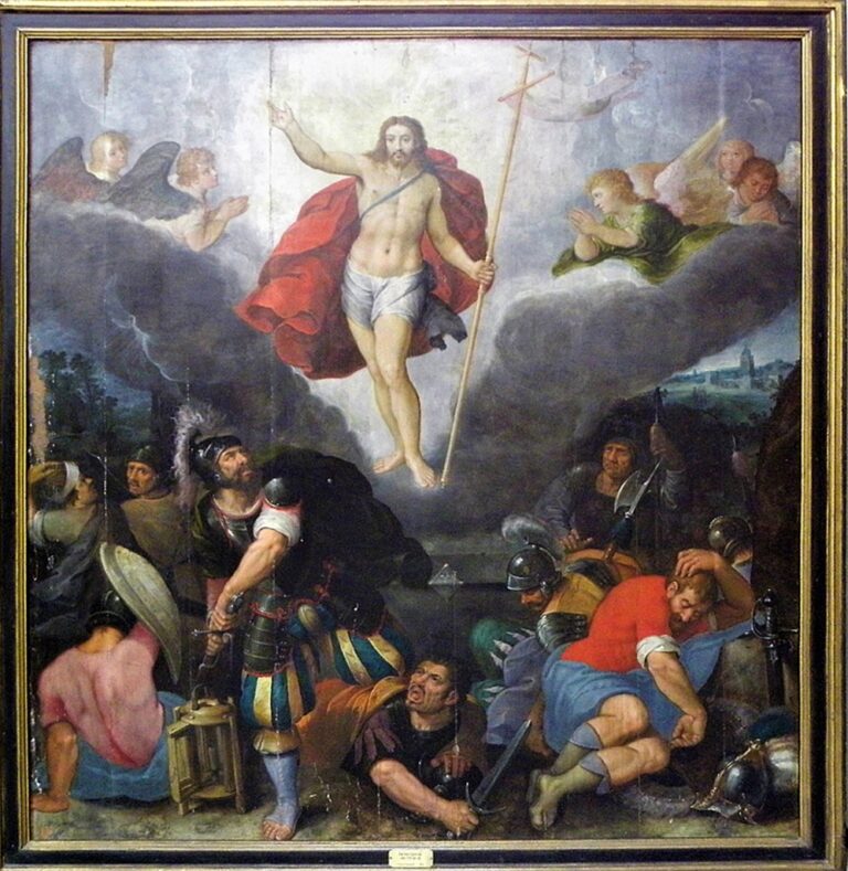 De soldaten die bij Jezus’ graf de wacht houden om te verhinderen dat Jezus’ leerlingen zijn lijk zouden stelen om een verrijzenis te insinueren (Mt. 27:62-66) zoeken verschrikt bescherming. Uitgerekend ook deze wachters worden ongewild de eerste ooggetuigen van Jezus’ opstanding (Mt. 28:4). Het “beven van schrik” (v.4) wordt op menige wijze in beeld gebracht. Van ontzetting is er één, geheel op de voorgrond in het midden, neergestuikt en steekt de tong nog uit zijn mond. De beschrijving “het leven scheen uit hen geweken” (v.4b) is herkenbaar in zijn verstarde blik. De sodlaat die over hem heen stapt, trekt zijn zwaard alsof hij het tegen een spook wil opnemen. De soldaat in de linkerbendenhoek tracht zich met het schild aan zijn rechterarm van het hevige licht af te schermen. Anderen houden zich gedeisd of kijken verschrikt toe. Rechts blijven enkele wachters, die zich niet van hun taak kwijten, ongestoord slapen; wat toelaat de leugen van de diefstal van Jezus’ lijk aannemelijk te maken (Mt. 28:13). Immers, aldus Mt. 28:11-15, werden deze soldaten nadien omgekocht om hun bericht over wat was voorgevallen te vervalsen als een diefstal van Jezus’ lijk door Zijn leerlingen terwijl zij sliepen (v.13).