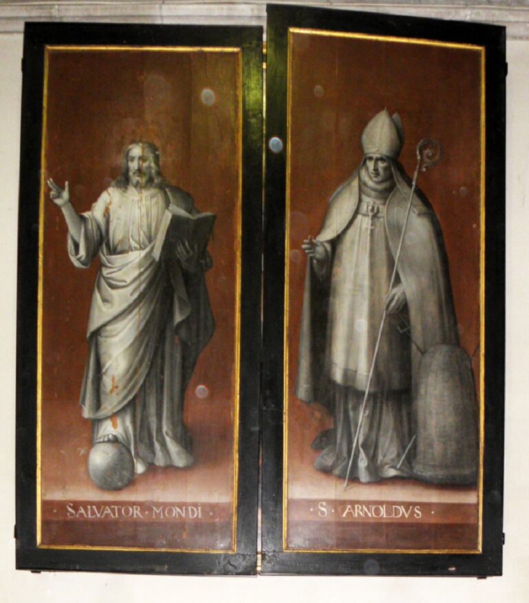 Tijdens een pestepidemie helpt Arnoldus (of Arnulfus), bisschop van Soissons (Tiegem ca.1040 – Oudenburg, 1087) de bevolking aan de dood te ontkomen door zijn aanbeveling om in plaats van (besmet) water, bier te drinken. Om begrijpelijke redenen kiezen de brouwers hem tot patroon van hun ambacht. Omdat de schilder aanvankelijk een andere heilige bisschop geschilderd had, heeft hij gemakkelijkheidshalve gecorrigeerd door Arnoldus’ brouwersattributen van gekruiste vorken en een stuikmand toe te voegen en de naam van die eerste goedheilige man eenvoudigweg te overschilderen.